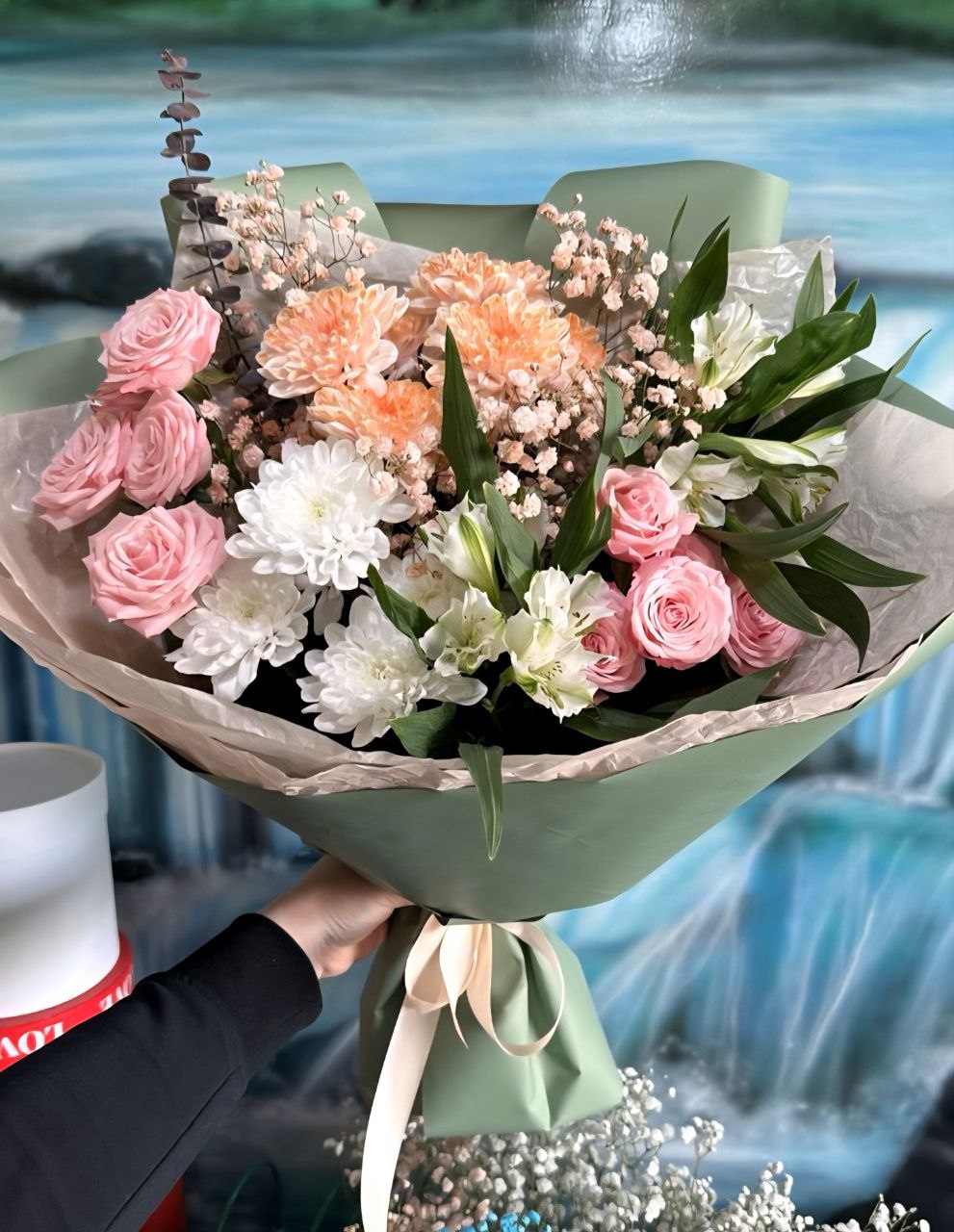 Хризантема, Альстромерия, роза кустовая, гипсофила, эвкалипт |